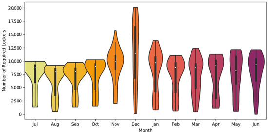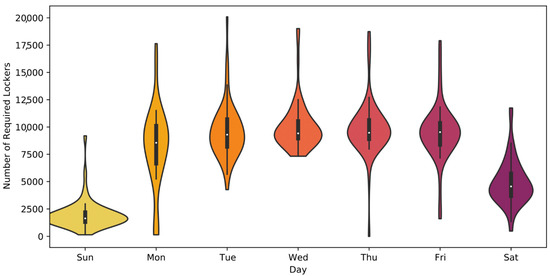 Figure 2 and Figure 3 show the number of locker spaces required if all parcels would be delivered to the lockers per month and per day, respectively. The wider the violin plot, the more times this specific number of parcel lockers is needed. The outer line of each violin plot [37] was estimated based on a kernel density estimation of the raw data. The number of lockers required each day ranges every month from 0 to more than 9000. The low numbers are due to the reduced number of parcels being delivered on Sundays, as seen in Figure 3. For example, in April, no parcels were delivered on weekends. This means that only a few lockers were required on Sundays for the parcels, which were picked up on the following Monday by employees, and contained parcels forgotten to be picked up by customers. In November and December, the number of lockers required each day peaked, while April, July, and August (the Easter and summer holiday seasons) represented the times of lowest demand. The number of lockers required per day in December varied more compared with other months because of the high demand before Christmas and the low demand during the holidays. The majority of parcel lockers were required on Wednesdays and Thursdays (Figure 3), while Sunday was the day with the lowest number of parcel lockers required. The average number of parcel lockers required was higher on Mondays than Tuesdays, which could be due to people ordering on the weekend and using 24 h or 48 h delivery. Figure 2 and Figure 3 show that it is difficult to achieve a high utilization of parcel lockers because of the varying demand for parcel lockers.