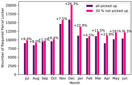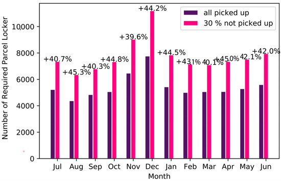 If the number of available locker spaces was smaller than the maximum number of required locker spaces on any day of the year, some parcels could not be delivered. If only the 99.9-percentile of the required number of parcel lockers was satisfied, less than 0.02% of the parcels cannot be delivered. For the 80-percentile, around 5–8% of all parcels could not be delivered (Figure 8).