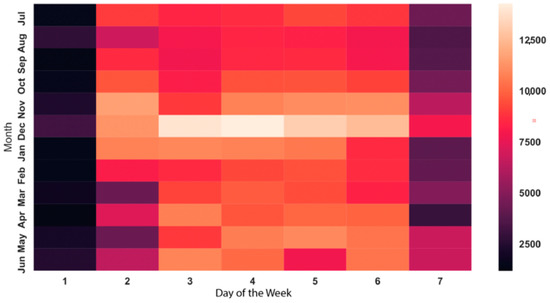 As can be seen in Figure 3 and Figure 6, the mean number of lockers required on Sundays and Saturdays is low for all months. On Wednesdays, five times as many lockers were required compared with Sundays, on average. Saturdays required half as many parcel lockers than Wednesdays, on average. The number of required lockers during the rest of the week was 1–18% smaller than for Wednesday. The required number of parcel lockers was the highest in December for any day of the week.