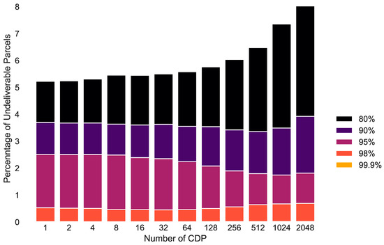 Figure 7 shows the number of locker spaces required to satisfy the demand at varying numbers of percentiles from 80%–99.9%. It can be seen that around twice as many lockers were needed if the number of lockers had to be enough for all days compared with being enough for 80% of the days. As expected, the number of lockers required increased with the number of CDPs because of the randomness of the allocation of parcels to CDPs.