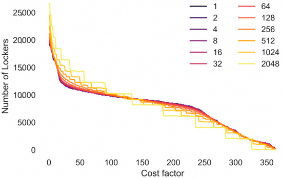 Neither the cost to set up a parcel locker network nor how the cost to deliver one parcel to a staffed CDP will change in the future, which are available a priori. Therefore, the authors refrained from making assumptions about the exact costs and instead used the cost factor to illustrate the results in this paper. Using this factor instead of the actual cost has the advantage that the optimization problem has to be solved only once for a selection of cost factors, even if the actual costs are changing. This also allows delivery companies to get an understanding of the range of the cost they can expect, and how this changes depending on the number of CDPs or future changes in the parcel demand. Both of which might not be known a priori when planning a parcel locker network.