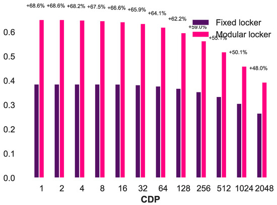 Using modular lockers has been suggested in the literature as an option to improve the utilization of parcel lockers [25,26]. Modular lockers work like fixed lockers but the number of locker spaces are adjusted periodically depending on the demand. Hence, in the low demand season, only a few modular lockers spaces are available at each CDP, whereas in the high demand season, the number of modular locker spaces at a CDP is increased. While a comparison of modular and fixed lockers is not the goal of the study, both have been compared to highlight the limitation of modular lockers. Depending on the number of CDPs, the utilization of fixed parcel lockers ranged between 25% to 35% if all parcels were to be sent to fixed lockers.