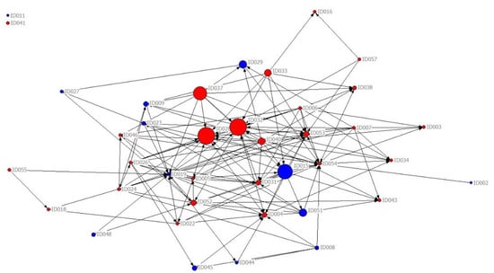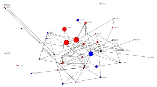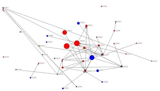 A firm’s cognitive position indicates how much the firm is interconnected (n terms of knowledge received and transferred within the cluster, and it was operationalized as the ratio between in-degree and out-degree centrality for each firm []. In-degree centrality is the sum of the number of ties received by actor i, while out-degree centrality was calculated as the number of ties given by actor i to other network actors []. In this study, we estimated in-degree and out-degree centrality according to the relationships mapped within the cluster. According to Giuliani and Bell [], the firm is a net absorber of knowledge if this ratio is above one, a mutual exchanger if it is equal to one, and a source of knowledge if it is below one. Moreover, if a firm does not have connections at all, i.e., it has zero in-degree and out-degree centrality, it must be considered as isolated.