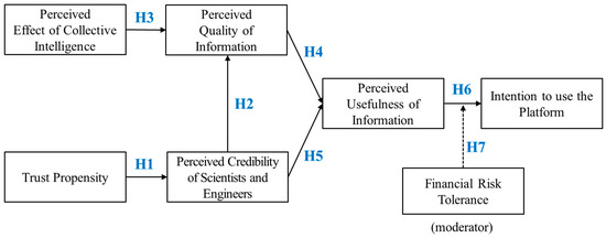 The quality of information affects the operational performance of crowdfunding [39]. The perceived information quality also has a negative impact on the perceived investment risk [47]. Sussman and Siegal examined how knowledge workers are affected by adopting advice they receive in mediated contexts and emphasized assessing the information’s usefulness as a mediator in the information adoption process. They recognized argument quality as a central route, source credibility as a peripheral route, and information usefulness as a mediator. According to Sussman and Siegal’s information adoption model, information adoption is determined by two leading variables, argument quality and source credibility [34]. In the context that Sussman and Siegal’s findings would also be valid in mass intelligence of scientists and engineers, we derived two variables: perceived quality of information and perceived credibility of scientists and engineers as leading variables for the perceived usefulness of information [34]. Thus, the fourth and fifth hypothesis of the study are postulated as: