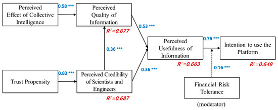This study used Structural Equation Modeling for the statistical analysis. The internal consistencies of scale were assessed through computing Cronbach’s Test. The construct validity was evaluated via convergent and discriminant validity. The results of testing the hypothesis using a structural equation model are presented in Figure 2 below. Findings show that all factors have a significant impact (p < 0.001). In support of H1, we found that trust propensity has a significant impact on the perceived credibility of scientists and engineers. The path coefficient between trust propensity and perceived credibility of scientists and engineers was the highest at 0.83. Additionally, the results indicate that the perceived quality of information is affected by the perceived credibility of scientists and engineers and the perceived effect of collective intelligence. Hence, H2 and H3 are also confirmed. The path coefficient (0.58) between perceived quality of information and perceived effect of collective intelligence was higher than those (0.36) of perceived quality of information and perceived credibility of scientists and engineers. This suggests that individual investors perceive the effect of collective intelligence formed through collaboration more than trust in a group of experts who are scientists and engineers. Accordingly, the crowdfunding platform needs to be designed with structures that facilitate collaboration among experts participating in the platform. In addition, it was confirmed that the perceived usefulness of information is affected by both perceived quality of information and perceived credibility of scientists and engineers with path coefficients of 0.53 and 0.36, respectively, at a significant level of 0.1%. Thus, H4 and H5 are supported. Among them, they were found to be more influenced by the perceived quality of information. This means that more resources and efforts must be put into improving the quality of the information provided to attract participation from individual investors in the crowdfunding platform. Further, we found that the intention to use the crowdfunding platform involving scientists and engineers is influenced by the perceived usefulness of the information. The path coefficient of 0.76 indicates a strong positive relationship. Thus, H6 is supported.