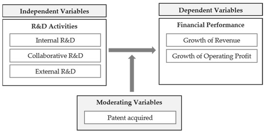 Xu and Sim identified four types of R&D activities: intramural R&D, extramural collaborative R&D, external knowledge, and technology adoption [29], and a study by Yun on small- and medium-sized businesses indicated a significantly positive correlation between enterprise technology innovation and R&D activities [30]. However, enterprises cannot create all the technology and knowledge required to establish a competitive advantage by themselves, especially in the absence of the necessary technology. Consequently, they should explore and adopt technology and knowledge externally [30]. A study by Chesbrough found that joint R&D activities have a significantly positive effect on both product and process innovation [31,32]. Meanwhile, Yun, Won, Park, and Yang divided enterprise R&D activities into three components: internal integration of R&D, cross-functional collaboration of R&D, and internal integration and cross-functional collaboration of R&D, among which knowledge exchange through internal integration of R&D departments and cross-functional collaboration improved the performance of technological innovation [32].