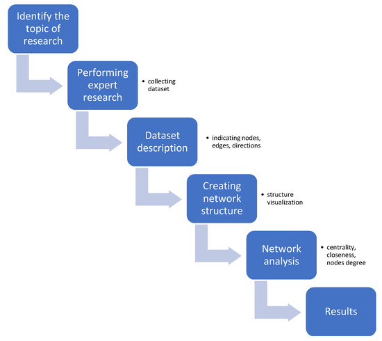 The method allows indicating the direction of each relationship, interrelationships between elements, and their influence on the defined sets of issues [46,47]. The main advantage of the SNA method is its ability to reconstruct, visualize, and analyze complex and multilevel relationships occurring in a given phenomenon, taking into account both direct and indirect relationships between issues [44]. Research with the use of SNA analysis allows determining the influence of individual groups on the processes taking place in a given network [43,44].