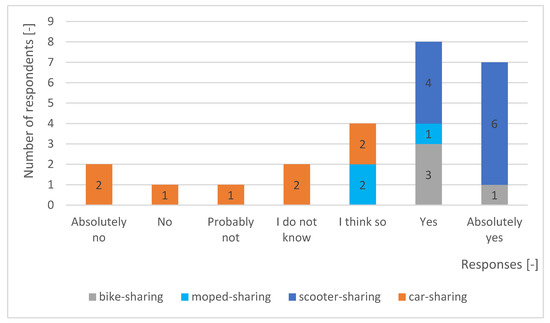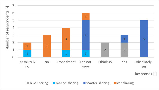The results show that most of the respondents are unsure about joining MaaS. Interestingly, the operators who expressed their opinion as “yes” or “absolutely yes” were the operators of micro-mobility services, such as scooter-sharing and bike-sharing operators. Once again, the most reluctant group were car-sharing operators, who expressed their opinion as “absolutely no”, “no”, and “probably not”. Moped-sharing systems are an uncertain group to join MaaS.