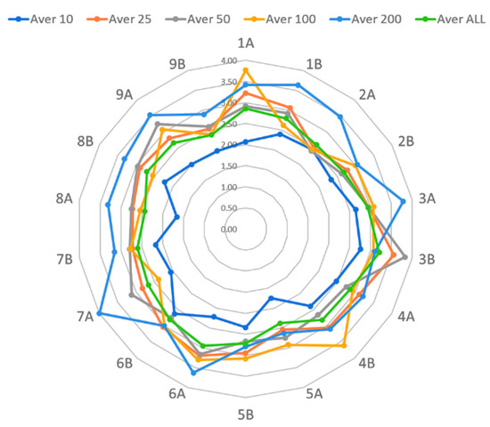 In the group of companies with 10–20 people employed (dark blue line, “Aver 10”) the results of the self-assessment for almost all elements were slightly lower than for larger enterprises. On the other hand, for larger companies, the self-assessment results were slightly higher for questions, but for some questions, it was 1–1.5 points higher than for other companies. For example, among the largest companies—in the category “200” (see light blue line, “Aver 200” in Figure 2)—higher self-assessment results were returned for questions 3A—market and customer management approach, and 7A—management group organization. In turn, in the “100” category of companies (yellow line, “Aver 100” in Figure 2) the higher result was returned for questions 1A—Business Model (Approach) and 4B—Supply Competitiveness (Results).