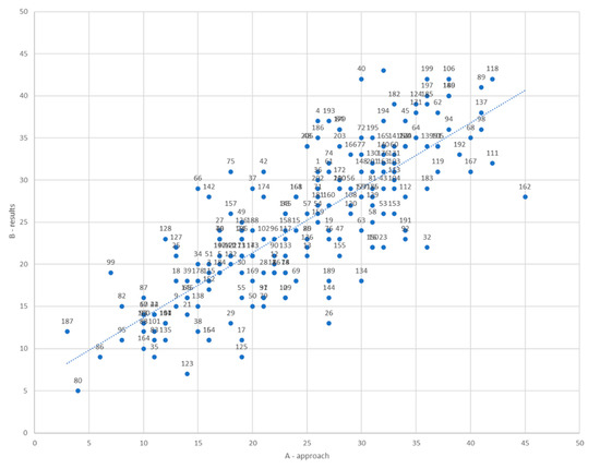 A scatter diagram showing sums for Approach (A) and Results (B) (N = 205).