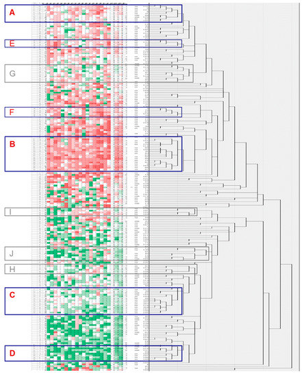 The dendrogram of all 205 enterprises is presented on the right in Figure 5. The self-assessment results table for all 205 enterprises, rearranged according to the dendrogram and colored with the red-to-green color code, is presented on the left in Figure 5. Enlarged parts of this picture are presented further in this section—part of the dendrogram representing Cluster A is shown in Figure 6, and part of the table with the individual responses of Cluster A enterprises in shown in Table 5.