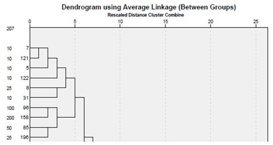 For data analysis and representation of results, statistical software tools (SPSS and MS Excel) were used [31]. The cluster analysis technique was used to group companies with similar management practices. A dendrogram using the average linkage between groups (based on a rescaled distance cluster combine) was used to identify clusters of enterprises with similar management practices and performance levels.