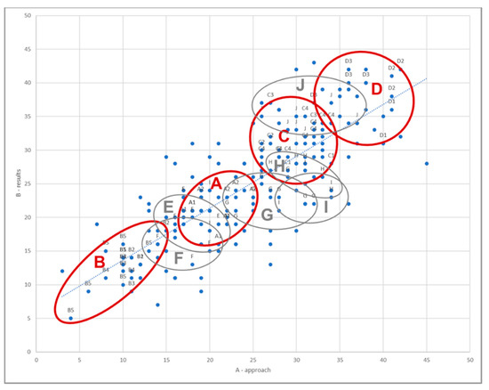 An attempt to form clusters using a distance larger than 5 can lead to an unusable outcome. For example, clusters G and J (as shown in Figure 5) consisted of enterprises with very different approaches and different results in many self-evaluation elements. Clusters I and H consisted of very small number of enterprises, which represented just 2–3% of the total number of respondents.