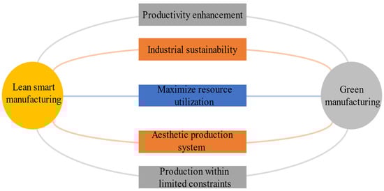 Smart lean–green is an open innovative approach in the present scenario of Industry 4.0 and it is key to the improvement in productivity problems on the shop floor. This approach assists in eliminating different inefficiencies on the production shop floor [16]. Lean–green is an integration of two approaches, and it is used to eliminate the wastefulness present in production processes and working environments [17]. Figure 1 demonstrates that the objective of the lean–green approach works in the present scenario of Industry 4.0.