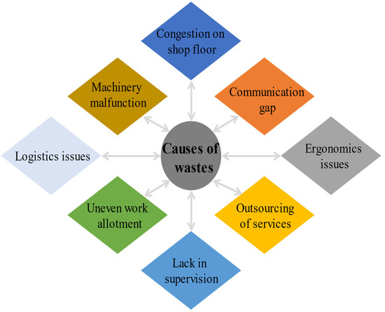 On the other hand, green manufacturing improves environmental performance in industries within limited financial conditions. The green manufacturing philosophy intends to enhance operational performance efficiency by eliminating environmental wastes [45]. Environmental waste is described as unethical uses of natural resources that could be hazardous for human beings and the environment [58]. Researchers have been focused on eliminating activities responsible for environmental waste because this waste directly affects operational performance, economical condition, safety, health, and readiness of workers. Figure 2 shows the possible causes of waste, including shop floor waste and environmental waste, found in a comprehensive literature review.