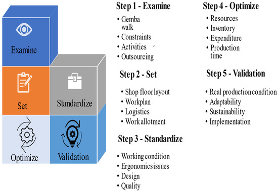 The proposed model consists of five steps as shown in Figure 3. In step 1, Gemba walk was used to observe the shop floor operational performance and production processes. Step 2 demonstrates that planning of production management system includes layout, work plan, logistics, and workload allotment. Step 3 determines the standards of different factors active in the production management system. In step 4, improvement was carried out to optimize resources, time, work in progress, and cost. Step 5 describes the proposed model’s applicability by evaluating production enhancement achieved in an actual production condition.