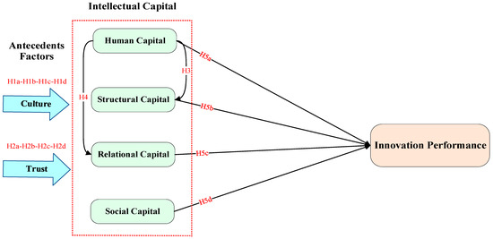 In the conceptual framework of the current study, there are two antecedent factors, culture and trust, one independent variable, namely, intellectual capital, and one dependent variable, namely, innovation performance, as shown in Figure 1.