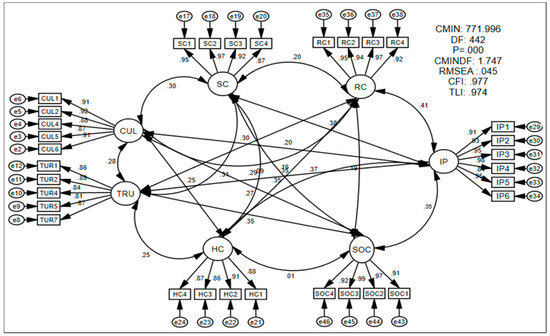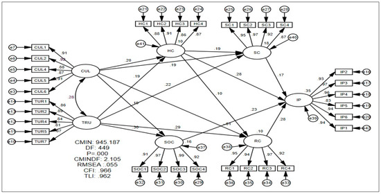 To quantify the antecedent factor (culture) to the independent variables, this study adopted seven items referred to by [34]. To measure another antecedent factor (trust), seven items as recommended by [69] were adapted. For selecting 12 items, the protocols of [116] were used, which helped measure the independent variables and the three primary components of intellectual capital (human, structural and relational capitals). Additionally, the fourth critical component of intellectual capital (social capital) was measured by adapting four items from the work of [117]. In this study, the dependent variables (six items) were used to measure the respondents’ innovation performance following [88] (see Appendix A). Responses were made on a 5-point scale ranging from 1 (strongly disagree) to 5 (strongly agree).