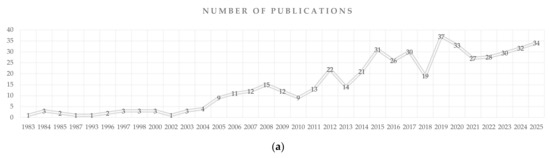 Evaluating the publications included in this bibliometric study allows knowing the progress, development, and research trends in the potential of technologies in the humanitarian supply chain. The first publication was in 1983. From 1983 to 2004, there were 27 publications, with an average of 2.3 publications per year (see Figure 2). The number of publications started to expand in 2003 (after the World Trade Center and the Tsunami in the Indian Ocean). Then, this natural disaster is directly correlated with the increase in publications produced in 2005, which was the year with the most publications on this topic.