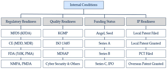 Hence, the research derived the following criteria for the internal conditions (candidate’s readiness) analysis: regulatory readiness, quality readiness, funding status, and intellectual property readiness (Figure 1).