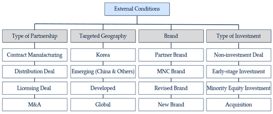Therefore, the following criteria for the external conditions are obtained: type of partnership, targeted geography, brand, and type of investment (Figure 2).