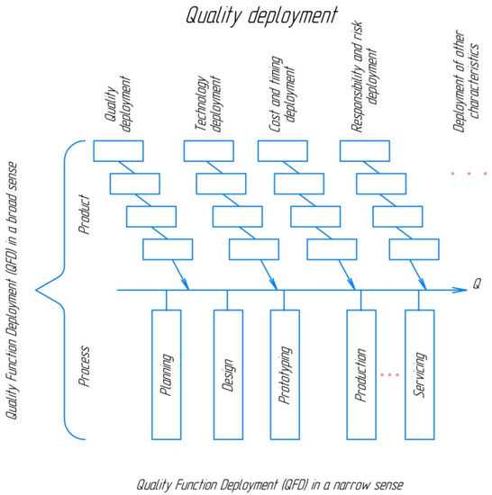 This method can result in the development of systems which are arranged by priority and link together the process of product development, guaranteeing the product quality demanded by consumers [44]. The main principle of QFD is to guide the development of products based on consumer demands. There are many formats of QFD, the most significant difference between them being the depth of analysis [45]. Quality function deployment, in a broad sense (or comprehensive QFD), is a combination of two formats: quality deployment and quality function deployment in a narrow sense. Quality deployment is a focus on the product and the deployment of the demands of the consumer alongside important factors of product manufacturing such as technologies, cost, reliability, etc. Quality function deployment, in the narrow sense, is a focus on processes and quality deployment according to the activities (functions) of the organization. The quality of the product is determined by the level of performing these functions [46]. Figure 1 shows comprehensive QFD—the simultaneous deployment of quality, technology, cost, and reliability across the whole project for the creation of products and across the organization as a whole [45].
