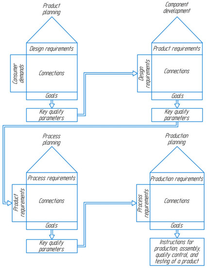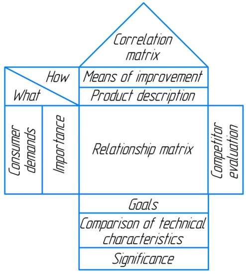 The QFD method is one of the most effective methods of market analysis. It is currently the most powerful method for transforming consumer demands into technical characteristics in product quality. It is used to improve currently manufactured goods and in the development of the next generation of goods. The QFD method is a sequence of measures implemented by the manufacturer to convert quality indicators into technical requirements for goods, processes, and equipment. This system guarantees that consumer demands drive the development and manufacture of goods [42]. Quality planning and quality design occur in the early stages of the QFD method and continue until the product is “deployed” [43].