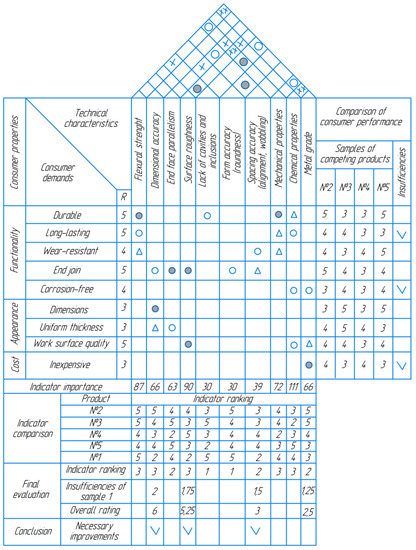 Based on the report on the results of marketing research of a customer survey, the consumer requirements for Laser Technologies products were determined. When clarifying these requirements, the factor model of consumer satisfaction with the following consumer requirements was taken as a basis: (1) functionality: great strength, durability, wear-resistance, and lack of corrosion; (2) appearance: dimension, uniformity in thickness, quality of the working surface; (3) cost, affordable price. When clarifying customer requirements, the factor model of customer satisfaction was taken as a basis and the following customer requirements were obtained: (1) great strength; (2) durability; (3) wear-resistance; (4) lack of corrosion; (5) dimensions; (6) uniformity in thickness; (7) quality of the working surface; and (8) affordable price. Using a pairwise comparison matrix, it was further revealed that the most important consumer requirement was “durability”, and the least important one was “uniformity in thickness”. At this stage, the technical characteristics of the product were developed, for example, (1) bending strength; (2) dimensional accuracy; (3) parallelism of end surfaces; (4) surface roughness; (5) lack of shells and inclusions; (6) shape accuracy (roundness); (7) spacing accuracy (alignment, wobbling); (8) strength properties; (9) chemical properties; and (10) metal grade.