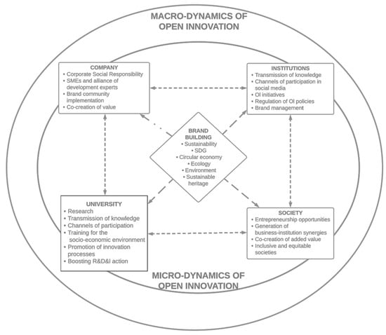 The concept of open innovation has moved from the triple helix to the quadruple helix as a model with which to identify connections across different stakeholders. According to [63], the triple helix model shows a non-linear model of innovation through interactions between universities, industries and government policies. The model proposed in this paper is based on the four-helix model (shown in Figure 1), including civil society, crowds strongly influenced by cultural contexts and the media.