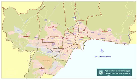 - Ayuntamiento de Málaga. Available online: https://www.malaga.eu/recursos/ayto/distritos/distritosd_municipales.html (accessed on 28 December 2021).