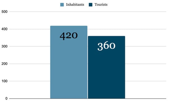 Of the 780 valid surveys, 420 were carried out on locals and 360 on visitors. As can be seen in Figure 4, 78.8% of the questionnaires were completed by locals and 22.2% by people who visited the city.