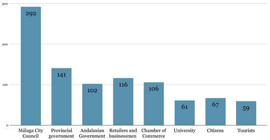 In the case of the last question, it was addressed exclusively to the 420 respondents who live in Malaga. Thus, a multiple-choice response was allowed among the eight options presented. The result is shown in Figure 9 and shows how, in the majority of cases, the City Council was identified as the necessary leader to develop and lead the building of the brand. With less than half of the responses (141 versus 292), the Malaga Provincial Council the leader. One third of the sectors considered as leaders is that of storekeepers and businesspeople. Thus, there is a hybridisation between the public sector (City Council and Provincial Council) and the private sector (storekeepers and businesspeople).
