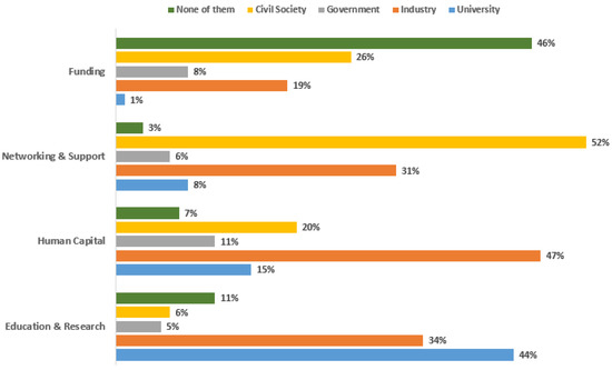 Finally, the descriptive statistics are reported in conclusion with the analysis of the start-up connections regarding enabling factors of four main dimensions: funding, networking, human capital, and education and research. Based on the results, as can be seen in Figure 5, the highest percentages of start-ups have been primarily based on civil society structures (52%) and private institutes (31%), with regards to their networking and connectedness. As for the education and research sector, these have mostly been influenced by universities (44%), while they mostly co-operated with structures belonging to the industry helix (52%) regarding the human capital sector. Last but not least, since funding is one of the primary “fuels” for a start-up, the vast majority of them (46%) did not connect with any of the four helices in one way or another (Figure 5).