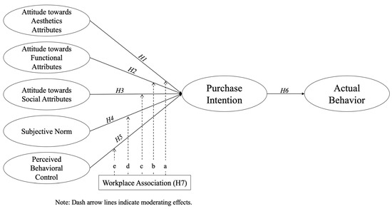 The effects of (a) aesthetic attitudes, (b) functional attitudes, (c) social attitudes, (d) subjective norm, and (e) perceived behavioral control on purchase intention are stronger for consumers with (vs. without) a workplace association, and purchase intention’s effect on actual behavior is stronger for consumers with (vs. without) a workplace association.