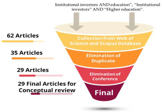 In this search of both databases, we found 35 articles from the Scopus database and 27 articles from the web of science database. After this, we eliminated duplicates and conference articles (6 articles), which gave us 29 articles that discussed the education sector and institutional investors in the article.