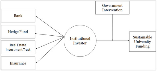 This initiative will also ease the burden on the government with regards to the education budget, on which most countries spend 1% to 5% of the country’s GDP. These funds can be diverted to other socio-economic development plans for the country or can be utilized as per the independent objectives of each country [66]. This initiative will offer the investment opportunity for both the higher education system and institutional investors of the country, which will act as a blue ocean strategy by the government where an investor can find a new market for investment and return under the government’s governance. Therefore, this research proposes the following model of sustainable funding for universities and investment opportunities for institutional investors (Figure 7).