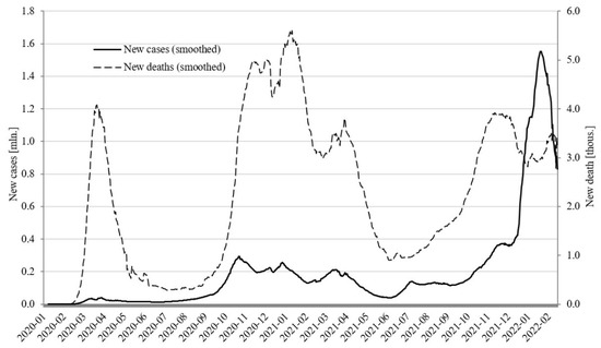 More than two years of experience in the mutation and spread of the virus increased the ability of scientists and state leaders to actually assess the situation and implement solutions to reduce the negative impact of the disease [38]. Figure 1 shows the evolution of the COVID-19 pandemic in Europe, as measured by the number of new COVID-19 cases and deaths from the virus (Figure 1).