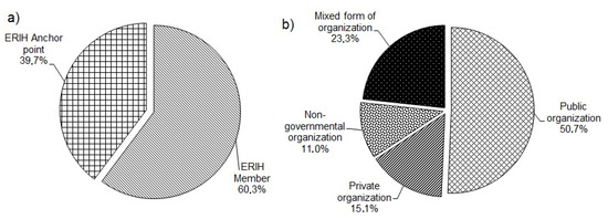 The surveyed group of cultural heritage tourism sites mostly belonged to the category of ERIH members (60.3%), i.e., more often than every other surveyed site. A total of 39.7% of the examined sites belonged to the ERIH Anchor Point category (Figure 2a). This meant that the obtained structure of the examined sites corresponded to the structure of the sites affiliated with the ERIH association (the test of significance of differences in structure indicators showed no significant difference between the fractions (p = 0.6244)).