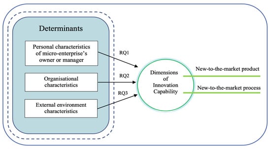 The important problem is that innovativeness has many facets, aspects and dimensions. One such interesting aspect is an enterprise’s innovative capability (IC). Usually, from the Resource-Based View, IC is understood as a combination of various types of resources conducive to the emergence of innovation [18,19]. Some studies have suggested, also, that IC allows the organization to adopt to competition, the market and the environment [18,20]. Smith et al. defined a firm’s IC as specific organizational capabilities for managing and creating innovation in the long term [21]. Forsman suggested that IC is composed of internal resources, capabilities and external input gained through networking [22]. In turn, Mendoza-Silva indicated that, due to its intangible nature, IC can be analysed and measured from different perspectives, i.e., dimensions, measurements (input or output) and determinants [23]. This paper concentrates on the determinants of two dimensions of IC in micro-enterprises.