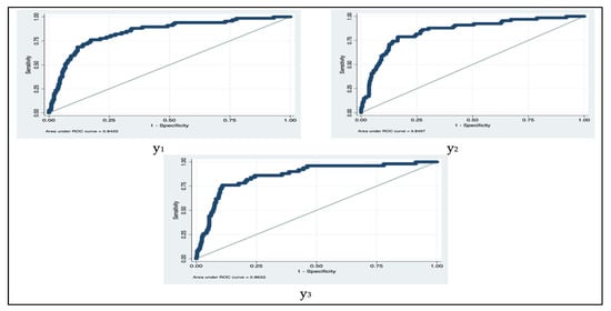 For the final model 4, the ROC curve was also used. The area under the ROC curve for the y1 model 4 was 0.8422, 0.8497 for y2 and 0.8633 for y3. The results are shown in Figure 2.