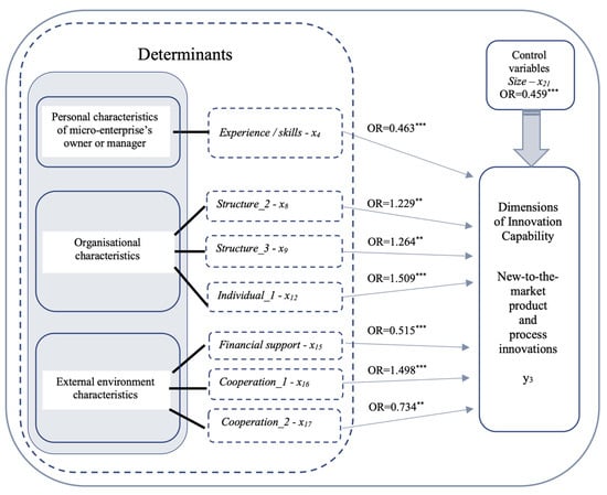 Innovation is an essential driver of companies’ growth and is important in securing and sustaining their competitive advantage and in the implementation of their entire strategies. In this process, a special role is played by companies’ capabilities, especially those related to innovation capability (IC). Despite many years of research into identifying the factors that influence IC, there are still many research gaps. One such concerns the IC of micro-enterprises. Only a few studies indicate certain factors that may affect micro-enterprise ICs. Thus, this article aims to analyse the determinants of micro-enterprises’ ICs from the perspective of implementing new-to-the-market product and process innovations. The theoretical framework adopted distinguishes between three groups of factors affecting micro-enterprise IC: personal, organizational and external environmental characteristics. The data examined come from an empirical study of a randomly selected representative sample of 1105 Polish micro-enterprises. To analyse these data, a logistic regression model was used. The results indicate that seven factors are common and significant determinants that explain the new-to-the-market product and process dimensions of micro-enterprise IC. Among them, the following have the greatest influence: engagement in initiatives for solving social problems, intensive cooperation with research centers, experience/skills and financial support.