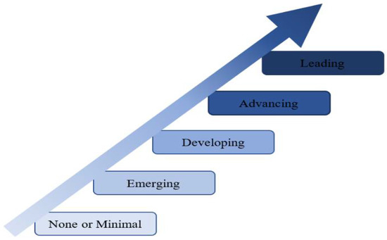The reason for adopting the Finnerty et al. [56] model was its strong focus on adopting energy-efficient technologies compared to the Prashar [58] model, which focused less on adopting energy-efficient technologies. There are five maturity levels: none or minimal, emerging, developing, advancing, and leading in the adapted model. The five different levels of maturity represent the status of energy efficiency. Level 1 (none or minimal) represents the lowest level of energy maturity. Then, the maturity gradually increases to reach the highest level (leading) at level 5. The levels between 1 and 5 represent the roadmap for energy-efficiency enhancement [56].