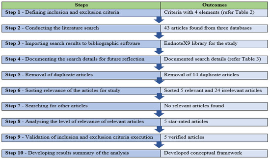Integrating best practices within the literature has been identified as a possible way to develop maturity models [63]. Therefore, this paper executed a scoping literature review method that is suitable for identifying key characteristics and factors [82,83] to develop an energy culture maturity conceptual framework using relevant energy culture studies. The procedure proposed by O’Brien and Guckin [84] was used to carry out the scoping literature review. The procedure consists of 10 steps based on the established Cochrane collaboration checklist. Ten steps of the procedure successfully cover the three elements of a research methodology: study design, conducting, and data analysis. Accordingly, the study design is explained in step 1. Then, step 2 to step 9 explains the process of conducting the study. Finally, the data analysis was carried out as in step 10. The steps of the procedure and outcomes of each step are depicted in Figure 3.