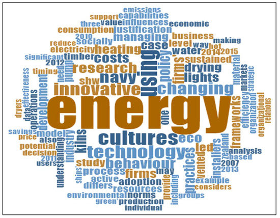Firstly, “energy” and “cultures” are prominent words in the word cloud. This demonstrates the focus on energy culture in the screened studies. Further, “using” and “technology” are identified as two prominent words, which reveals the focus of the selected studies on “adoption of technologies”. According to McNaught and Lam [90], word clouds enable users to gain a preliminary understanding of the nature of the data on hand. Furthermore, the most frequent words in this word cloud analysis show the relationship between the scoping review results and the research aim. Therefore, the word cloud analysis results have further confirmed the suitability of the selected articles from the scoping review for this study. Moreover, the word cloud analysis strengthened the eighth step of the scoping review to examine the relevancy of the results.