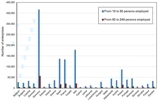 Therefore, the entire group of SMEs is made up of enterprises that have between 10 and 250 employees and an annual turnover of less than EUR 50 million and/or an annual balance sheet total of less than EUR 43 million [31]. For several years, the number of SMEs in the EU-27 has been increasing. Per every three jobs in the EU-27, as many as two are generated by this group of enterprises. Therefore, these enterprises are a key element of the EU-27 economy.