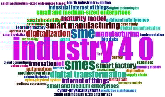 The total number of identified papers was 609 (as of 2 January 2022). The first work indexed in this database combining the concepts of Industry 4.0 and SMEs comes from 2014 and concerns technical requirements for efficient networking of companies in complex logistics and production systems of SMEs [35]. Since then, the number of publications on this topic has been growing, especially since 2016 (Figure 2). These publications address various research problems, including the implementation of Industry 4.0 solutions [36,37,38], sustainability and the Industry 4.0 concept [13,39], digital factories, business models, Industry 4.0-related technologies (IoT, AI, cloud computing, big data), digital readiness, and maturity assessment [24,40,41]. A summary of the most frequently cited keywords by the authors of these publications, in the form of a cloud, is shown in Figure 3.