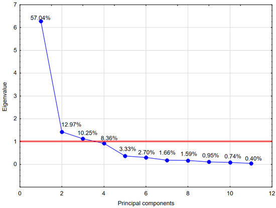 The idea of the PCA method is to reduce a large number of mutually correlated primary variables (11 indicators) to a few uncorrelated factors (principal components) that retain as much of the information about the phenomenon under study (contained in the primary variables) as possible. The observable input variables are transformed into new unobservable variables, which are called principal components (they are linear combinations of the primary variables). The principal components are ordered so that their variances become smaller and smaller. Since the new variables are uncorrelated, the sum of their variances is equal to the sum of the variances of the original variables, and as a result, the transformation of the variables does not lead to a loss of information about the phenomenon under study. Most frequently, the first 2–3 principal components contain the vast majority of information contained in the original collection of input variables.