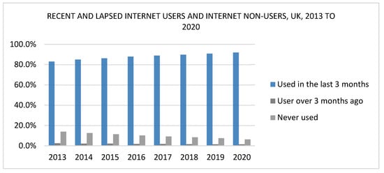 A key example of how technology has influenced our day-to-day lives is internet usage. In 2020, internet usage in the UK saw an increase of 2%, likely due to the ongoing COVID-19 pandemic and how using the internet has become more of a convenience (see Figure 1). This increase has indicated that in 2020, 92% of adults in the UK alone were recent users, with an estimated weekly usage of 24.9 h of activity [20].