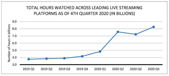 - Statista. Total Hours Watched Across Leading Live Streaming Platforms as of 4th Quarter 2020 (In Billions). 2021. Available online: https://www.statista.com/statistics/1264246/quarterly-live-streaming-hours-watched/ (accessed on 11 September 2021).