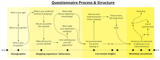 The first method adopted was quantitative research, and this took the form of a questionnaire. The data captured were categorical due to the questions being nominal, ordinal, and dichotomous. The questionnaire was conducted virtually via Google Forms. This ensured the data collected remained in the lower risk (medium) ethical category while still being able to reach a broad range of respondents. By using Google Forms questions were able to be branched and specific answers would take a specific route in the questions. The questionnaire was distributed via the social media platform Facebook and directed towards a smaller geographical area in the Northeast of England, specifically South Tyneside. The reason for focusing on this location was to capture how this area perceives, behaves, and understands live streaming and retail. When it came to the design of the questionnaire, it was imperative to ensure that the questionnaire was clear, unambiguous, and was understanding to respondents. When it came to the questionnaire, there were a total of 17 questions that respondents would have to answer, some of which were branching depending on the respondents’ choices. The questionnaire has been outlined in Figure 4 below.
